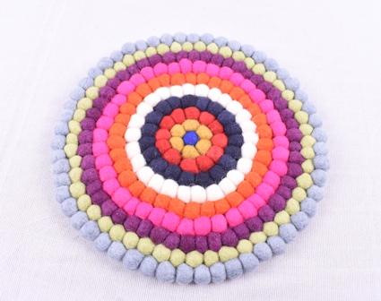 This round-shaped felt mat features a vibrant, multicolored design that beautifully transitions through a spectrum of hues arranged in concentric rings. Starting from the outer edge, the mat showcases a soft grey band, followed inward by layers of green, purple, pink, orange, white, navy blue, red, yellow, and finally a rich blue at the center. Each color band is made from plush felt, giving the mat a cozy texture and a lively yet harmonious appearance. The seamless gradient of colors creates an eye-catching, playful aesthetic, perfect for adding a pop of color and warmth to any room.
