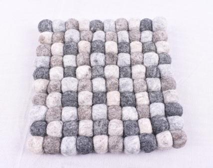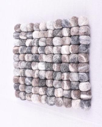 This handcrafted felt ball trivet features a charming mix of neutral tones including white, grey, beige, and charcoal. Made from tightly stitched natural wool felt balls, it offers excellent insulation and protection for your table or countertop. The soft, textured surface adds a cozy and rustic touch to your kitchen or dining space while serving as a practical heat-resistant mat for hot dishes, teapots, or pans.
