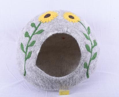 This cozy felt cat house in a soft grey hue offers the perfect retreat for your feline friend. Crafted from durable yet gentle felt material, it provides a warm and comfortable hideaway. The entrance is beautifully adorned with charming sunflowers on both sides, adding a cheerful and decorative touch to the design. Its compact size and elegant look make it a stylish addition to any room, giving your cat a peaceful spot to relax and feel secure.