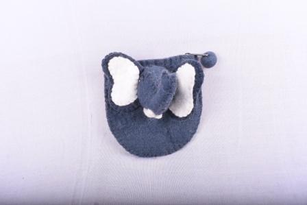 This handmade felt coin purse features a charming elephant design with a three-dimensional trunk and large, white flappy ears. Crafted from soft, high-quality felt in a deep grayish-blue tone, the purse is both functional and playful. The secure zipper closure is accented with a matching felt ball, adding a whimsical touch. Ideal for holding coins, keys, or other small essentials, this purse is perfect for animal lovers and those who appreciate artisanal accessories. Its compact size makes it easy to carry in a handbag or backpack.