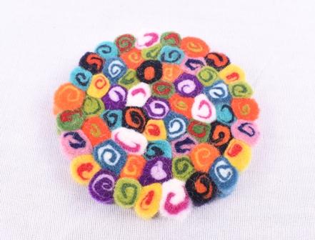 Add a burst of color to your space with this vibrant round felt mat, intricately handcrafted using coiled multicolored felt pieces. Each spiral-shaped roll is uniquely dyed in bright, cheerful hues including blue, orange, purple, red, yellow, green, pink, black, and white, creating a dynamic mosaic-like pattern. Perfect as a decorative base for vases, teapots, or simply as a cheerful accent on tables or shelves, this felt mat combines artistic flair with cozy texture. Made from natural wool, it’s soft to the touch, durable, and eco-friendly — a delightful blend of function and style.
