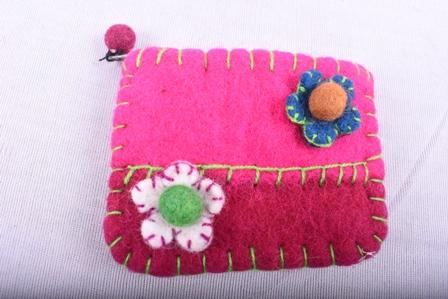 Bright and cheerful, this handmade felt coin purse showcases a charming blend of deep pink and magenta hues. Decorated with two colorful felt flowers — one with a green and white petal design and the other with a blue and orange center — this accessory brings a playful, handcrafted feel. The purse is outlined with visible green blanket stitching, adding to its artisanal appeal. A small round felt ball zipper pull enhances its convenience and charm. Ideal for storing coins, keys, or small essentials, this compact purse is both practical and stylish.